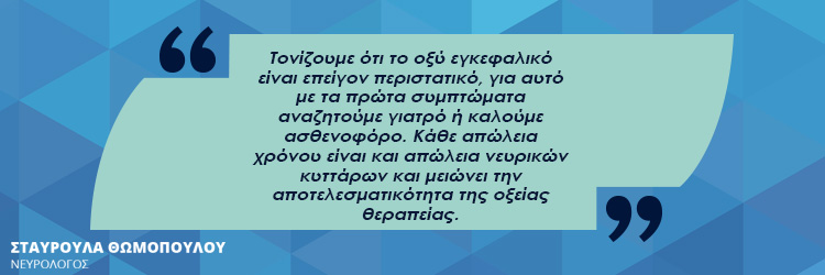 Τονίζουμε ότι το οξύ εγκεφαλικό είναι επείγον περιστατικό, για αυτό με τα πρώτα συμπτώματα αναζητούμε γιατρό ή καλούμε ασθενοφόρο. Κάθε απώλεια χρόνου είναι και απώλεια νευρικών κυττάρων και μειώνει την αποτελεσματικότητα της οξείας θεραπείας. Για ασθενείς που πληρούν κάποια κριτήρια και προσέλθουν το αργότερο 4,5 ώρες μετά την εμφάνιση των συμπτωμάτων, μπορεί να δοθεί ένα φάρμακο που διαλύει το θρόμβο με εντυπωσιακά αποτελέσματα.